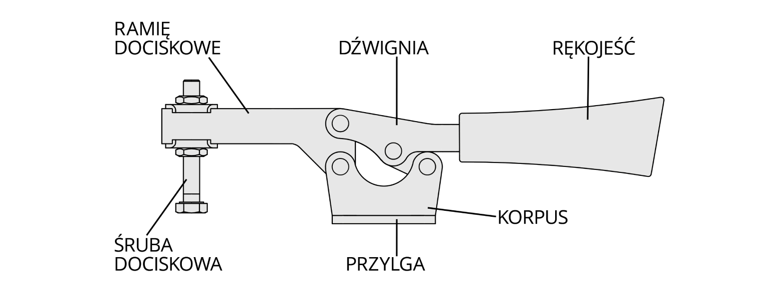 - Dźwignia i ramię dociskowe: Połączone są przegubami, które przekształcają ruch ręczny w siłę docisku.